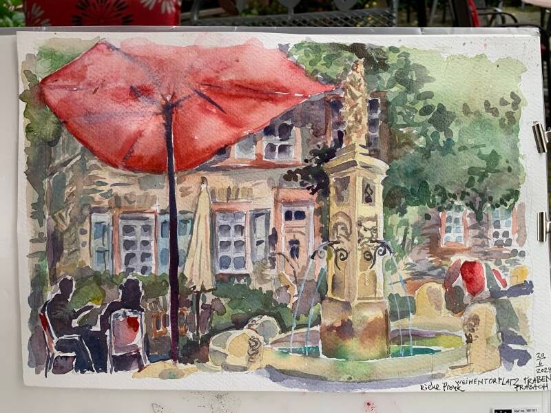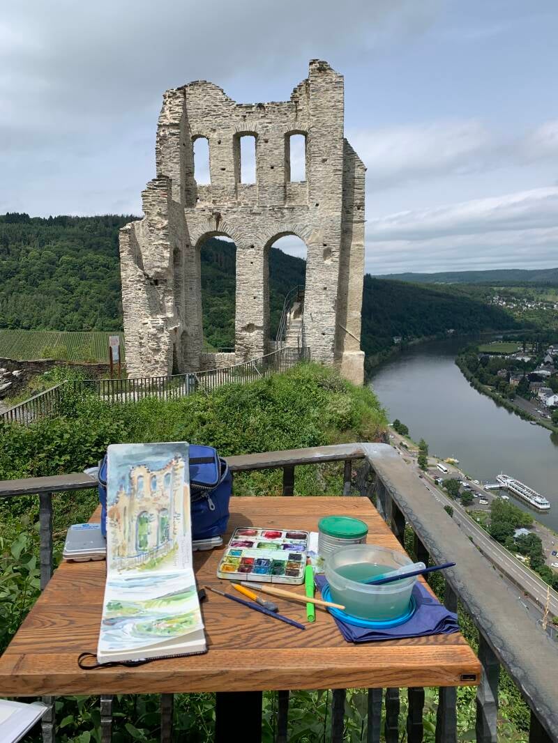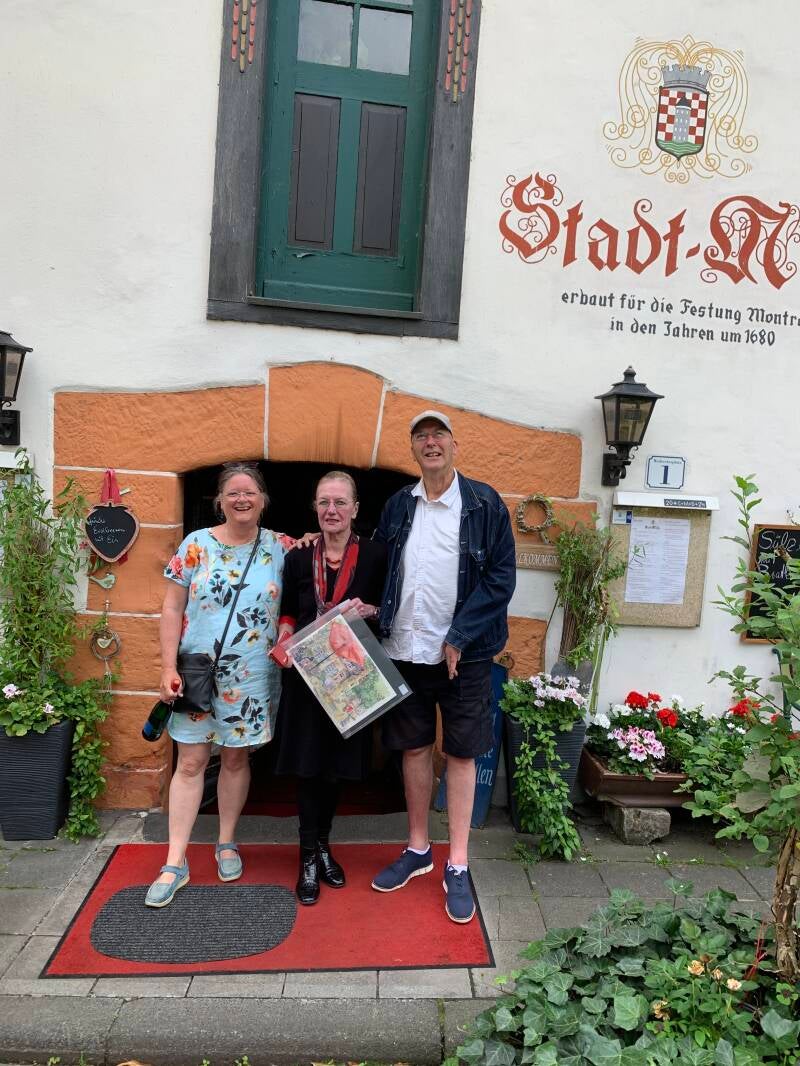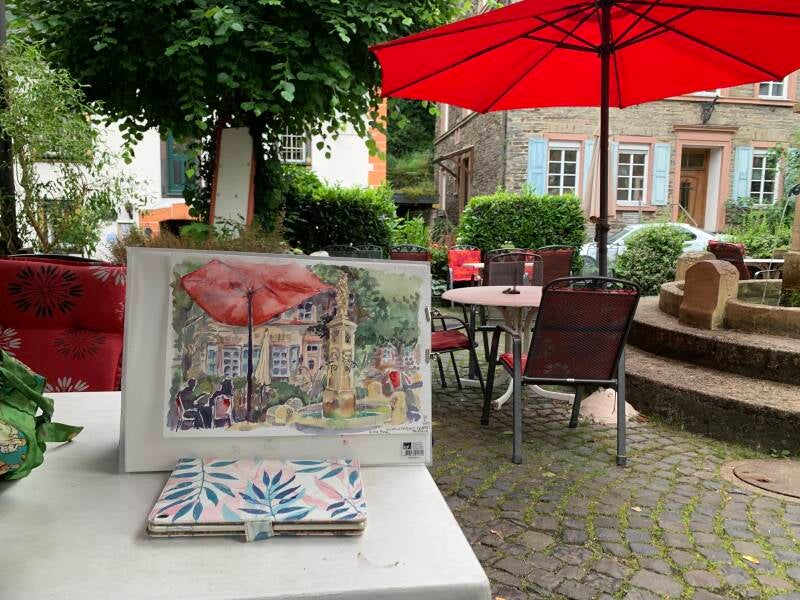 Johan Pronk en ik zijn terug van onze tweeweekse Moezelreis. Niet voor niets heb ik mijn aquarel spullen meegenomen, want er was veel moois te schilderen. We verbleven in Trier voor de Romeinse bezienswaardigheden, zoals de Porta Nigra. En in Traben-Trarbach, waar ik het pleintje bij ons appartement schilderde #urbansketching. En het uitzicht vanaf de Grefenburg. Op het moment van ons vertrek kwam de eigenaresse van het restaurant aan het plein , de“ Stadt-Mühle “vragen of ze mijn aquarel mocht kopen. Dat mocht natuurlijk, dat vind ik erg leuk! Even samen op de foto met die nette Hollander moest natuurlijk ook. Overigens een leuk restaurant om forel te eten. Die worden ter plekke uit de bak gevist in het restaurant, waar de beek doorheen stroomt die vroeger het Molenrad aandreef. #uskdeutschlan