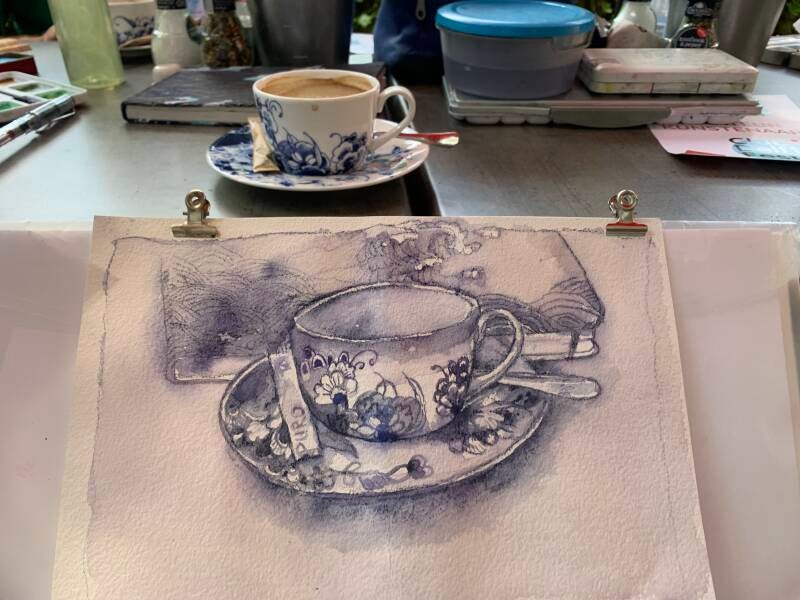 Terug in Delft na onze Moezelreis hebben we met ons schildergroepje heerlijk in de schaduw geschilderd bij café restaurant Blauw bij het Prinsenhof.